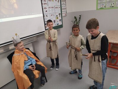Vďaka tematickému vyučovaniu, sa dnes naši štvrtáci preniesli do Veľkomoravskej ríše. Na hodine slovenského jazyka sa prostredníctvom dramatizácie oboznámili s povesťou o Svätoplukových troch prútoch. Vyskúšali si tak, aké je prelomiť samotný prút či viazaničku prútov. Na matematike rozdeľovali zlaté mince, zisťovali obvod hradieb či pracovali s časovou priamkou. Telesná výchova sa niesla v znamení hier, kde žiaci museli spolupracovať.